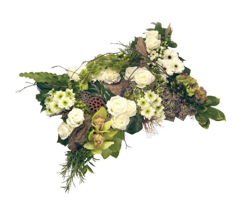 A stunning textured pillow design in shades of green and white, featuring Roses, Cymbidium Orchids, Chrysanthemums and Hydrangea with a variety of sumptuous green foliage.