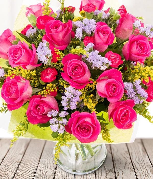 A vibrant Spring bouquet full of pink roses, pink spray carnations, robusta and seasonal foliage.